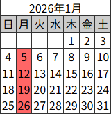 カレンダーの白い色の日にちは 18:00~24:00 営業カレンダーの赤い色の日にちはお休みです