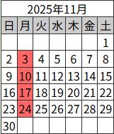 カレンダーの白い色の日にちは 18:00~24:00 営業カレンダーの赤い色の日にちはお休みです
